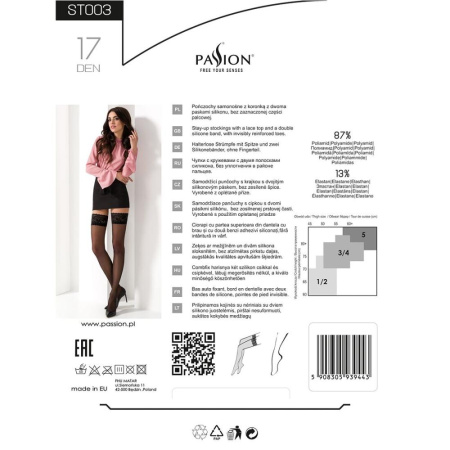 Предлагаем купить тонкие чулки от европейского бренда Passion. Модель ST003 nero имеет элегантный дизайн и очень удобный фасон. Ажурная резинка шириной 9 см с двумя силиконовыми полосками надежно фиксирует чулки на нужной высоте. Благодаря этому изделие получилось очень практичным и в то же время стильным. Силиконовые вставки позволяют надевать тонкие чулки без дополнительных аксессуаров, но при желании вы можете комбинировать их с поясом.