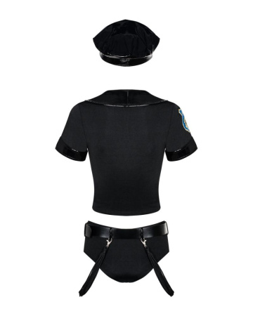 Эротический костюм полицейского Obsessive Police set пошит из черной эластичной ткани, которая хорошо тянется и очень красиво облегает тело, подчеркивая его преимущества. Короткий топ на молнии с манжетами и воротником из винилового материала туго облегают полушария груди. Значок на форме гласит, что на страже порядка самый смелый и опытный полицейский. Если что-то не понравится, она может применить силу и даже достать наручники.