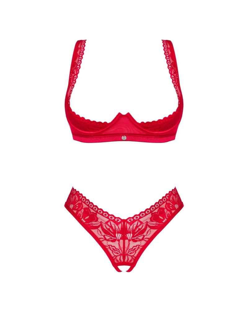 Предлагаем купить комплект белья Obsessive Lacelove cupless 2-pcs set, который состоит из стрингов с открытым доступом и бюстгальтера с открытой грудью, а яркий красный цвет комплекта добавит страсти вашему образу.