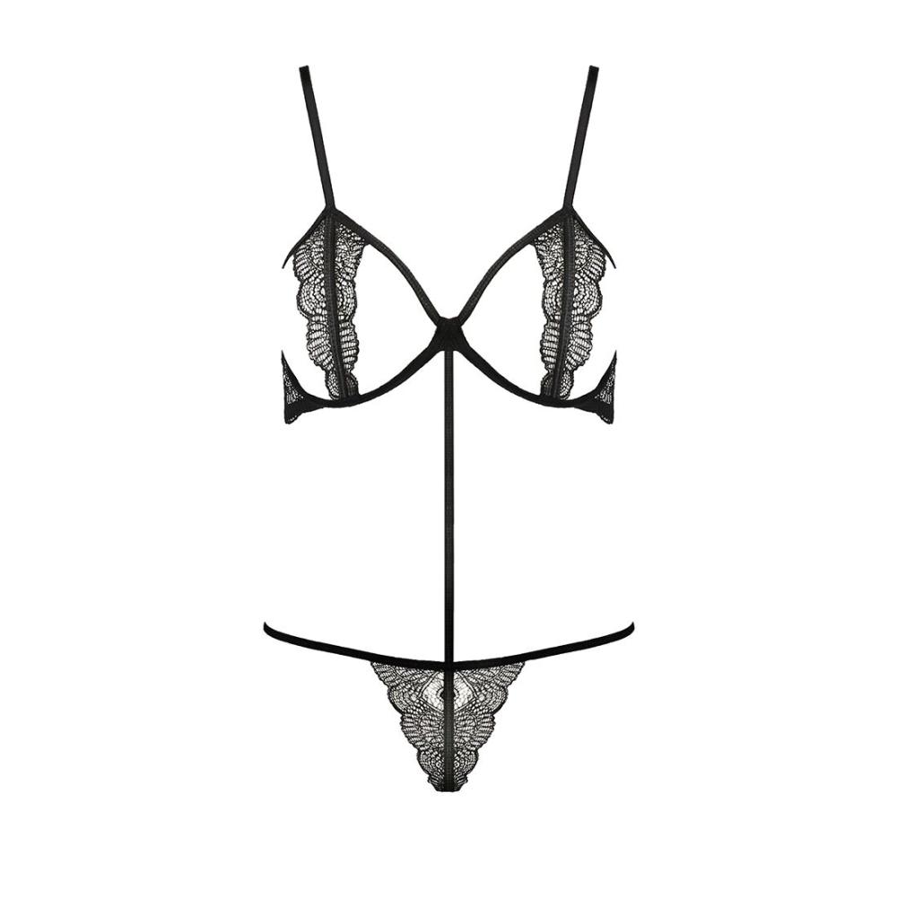 Такого комплекта вы еще не видели! Роскошное открытое бра, хорошо поддерживающее грудь за счет косточек и конструкции, оставляет незабываемое впечатление. Тонкие стринги с кружевом идеально садятся на бедра, не пережимают тело и красиво смотрятся. Дополнительный ремень через тело дает простор для фантазии.
