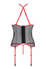 Корсет с пажами выполнен из черной прозрачной ткани и красивого кружева, обшит красной каймой. Сзади корсет Passion оснащен застежками по всей длине спинки, а спереди на шее и груди имеются застежки, которые легко расстегнуть в процессе бурных развлечений.