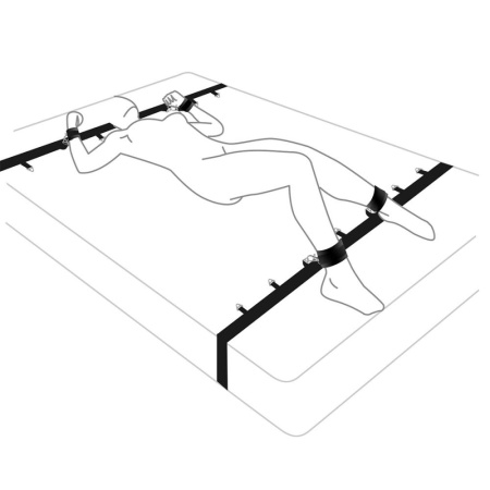 Ремни надеваются на матрас, к запястьям и лодыжкам крепятся наручи и поножи с металлическими кольцами, за которые, собственно, и пристегивают партнера к растяжке. Пошевелиться невозможно, единственная подвижная часть тела, доступная привязанному партнеру – рот. Им можно делать все, что пожелает ваш Доминант. Для более качественной прожарки, рекомендуем перевернуть партнера на живот, и снова пристегнуть к растяжке.