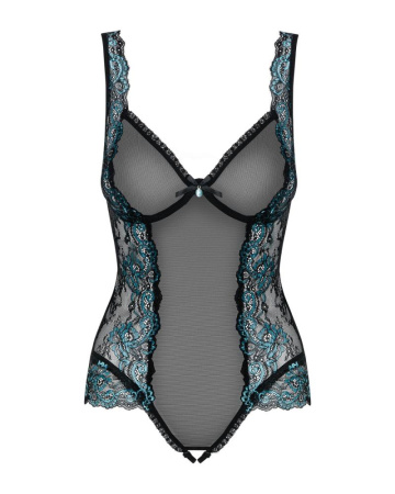 В чашки лифа очень удачно вшиты косточки — это позволяет поддержать и красиво очертить грудь. Украшенные кружевом регулируемые бретели можно откорректировать по длине для большего удобства и лучшего прилегания. Кулон-украшение между грудью притягивает взгляд и как будто просит коснуться и ласкать. Широкие вставки из шикарного кружева по бокам визуально делают силуэт стройнее. Черный цвет искусно сплетается с нежно-голубым, подчеркивая и выделяя утонченный рисунок изысканного кружева. Тончайшая нежная сеточка ложится на тело, эротично его прикрывая, но оставляя возможность рассмотреть все пикантные детали и в особенности — неоднозначный намек на открытую промежность с регулируемыми эластичными ремешками.