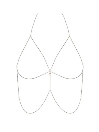 Это легкое и практически незаметное украшение создано, чтобы подчеркнуть нежность и хрупкость. Золотистая тонкая цепочка из маленьких круглых звеньев от шеи спускается вниз, красиво образуя два изгиба и соблазнительно обрамляя бюст. Кулон-звездочка ярко поблескивает между грудью. Сзади цепочка изысканно украшает спинку, цепляясь карабинами за звенья на шее. Цепочка для бюста с кулоном-звездой Obsessive Bijou 902 смотрится потрясающе поверх платья, белья или на обнаженном теле.